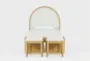 The Seren Twin Wood & Upholstered Platform Bed with Double 3-Drawer Underbed Storage Unit & 2 Stools offers a stylish and functional addition to any child's bedroom. Featuring a Scandinavian design, this bed is made with birch veneer, solid rubberwood, and boucle fabric. The platform bed includes ample storage with its double 3-drawer underbed storage unit and comes with two versatile stools.