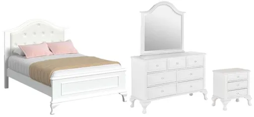 The Jesse Full Panel 4-piece bedroom set guarantees your little one sweet dreams. Its beautifully crafted bed features a faux leather headboard adorned with chic white buttons. Dustproof case pieces, dovetail drawers, and solid wood frames ensure the sturdiness of this set adorable set.