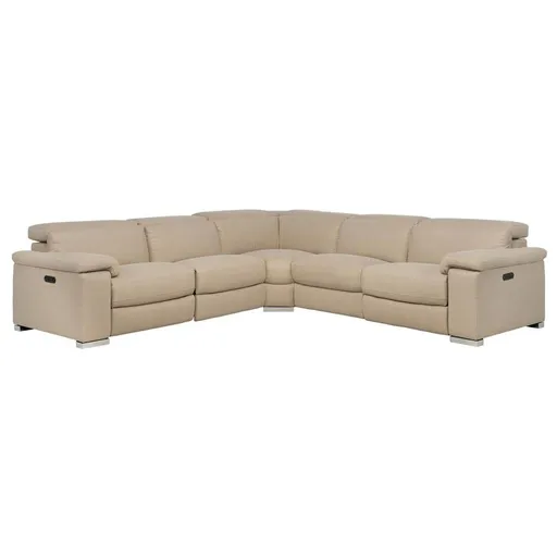 Elevate the style of your living room decor with the Karly Beige Power Reclining Sectional with 5PCS/3PWR. Made of performance fabric, this transitional style sofa boasts a lovely light beige color, chrome legs and knife-edge padded armrests. Its power motion and ample seating ensure there's plenty of room for everyone to relax.