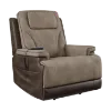Peaceful Pause Sand Power Lift Recliner with Heat and Massage from Signature Motion by Ashley Furniture. Weight limit of 300lbs. Frame constructed of hardwoods and furniture grade plywood. Quality foam cushion core construction. Covered in a mixed media application with a sand colored 55% polyester and 45% polyurethane on the seat and back with a darker brown on the outside and back. Features power lift with zero gravity recline, power adjustable headrest and power lumbar support. Heat and four zone massage including head, neck, shoulders and lumbar. Spot clean with water-based solvents, cc W.