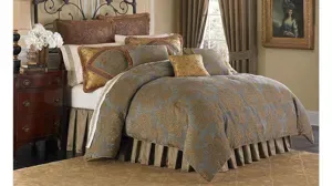 Find your timeless, grandiose style with the Victoria 7-pc. Cal King Comforter Set by Michael Amini. Made with beautiful spa blue chenille and golden tones with brown accents, this set features embroidered gold silk, a coordinating multi stripe and paisley accent patterns. All pieces are reversible. The oversized comforter reverses to a gold jacquard frame. Included is 1 comforter, 2 king shams, 1 bed skirt, 2 decorative pillows and 1 oblong pillow.