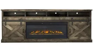 The Farmhouse 94" Fireplace Console highlights the rustic rolling barn style doors and metal accents that are now a staple in many homes across America. Reminiscent of simpler times, the farmhouse appeal is understandable and undeniable. This console holds up to a 107" TV and has plenty of room to show off your media gear and collectibles to impress all who visit. The house warming 42" fireplace insert has clear crystals and traditional log set with embers to keep you toasty while binge watching your favorite TV show or movie.