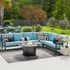 Experience the oversized comfort and structural strength of our exclusive Montecito Collection, featuring a handmade aluminum frame with a durable multi-step powder-coated and oven-baked clear coat finish. Each piece in this 5 piece sectional with a fire pit is built by laser welding to create fully welded and braced frames with zero weld marks. They feature PVC sling seat suspenion and include oversized deluxe Sunbrella® acrylic cushions. The 45° corner club chair adds extra width and comfort to the sectional. The textilene material's flexibility and sturdiness make it a comfortable material for seating.