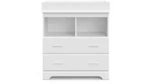 Premium "designer" accents, baby-changing functionality, and ample nursery storage are combined into one stunning package with our Brooks 2 drawer changing chest. This stylish & sturdy chest features a changing table topper that is designed to fit all standard-sized changing pads. In addition to the changing table topper, the Brooks changing chest features two spacious drawers (complete with euro-glide drawer tracks and durable steel hardware) and two open storage shelves. The Brooks sleek metal drawer handles add a premium, designer look and feel to your nursery. Crafted from durable engineered wood, the Brooks 2 drawer changing chest complies with all applicable ASTM International and CPSC safety standards. Also, the changing topper is JPMA Certified.