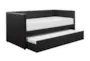 The Woodwell Black Leather Twin Daybed With Pull-Out Twin Trundle is a versatile addition to any bedroom or kids' room. Its traditional design features a comfortable backrest and a handy pull-out trundle for extra sleeping space. The bed is upholstered in durable faux leather, making it easy to clean and maintain.
