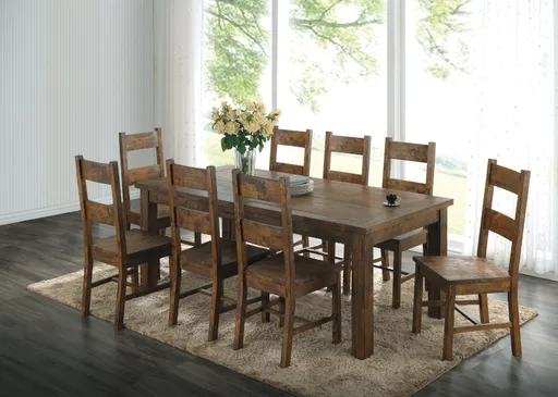 Coleman Dining Room Set with Ladder Back Chairs Classic Farmhouse Style Solid Asian Hardwood Showcases Various Knots and Grain Details Sturdy Post Legs Rustic Golden Brown Finish Provides Reclaimed Wood Look Ladder Back Chairs This Dining Room Set Includes Table 39 Wide x 79 Long x 30 High 8 Side Chairs 19 Wide x 20 Deep x 42 High Free Delivery Also Available Additional Side Chairs