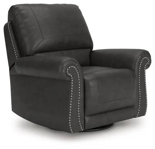 Everyone can have the best seat in the house with this swivel glider recliner. Its nailhead trim puts the finishing touches on the traditional roll arms you love. The recliner's comfy, durable cushions—wrapped in a rustic yet sophisticated faux leather—keep you feeling relaxed, while its turned legs show that style and quality flow from top to bottom. Plus the smooth reclining motion and 360-degree swivel keep you in the flow of conversation.
