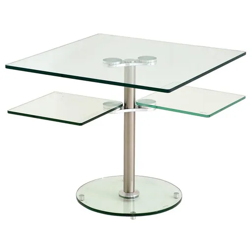 Fresh and dynamic, the Square Clear Side Table is a modern piece with many arms. Flat polished glass shapes are attached together by stainless steel pucks, so you can enjoy extra surface space on many levels. Display your snacks, books and more with a piece that is always ready to make a statement.