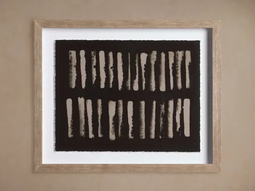 A series of dramatic statement pieces, each Ashen framed piece draws attention to linear forms in bold neutrals. Inspired by her childhood in Ohio as well as extensive world travels, Dawn Sweitzer uses abstract patterns that interact with materials, colors, textures, and finishes to arrange rich compositions.