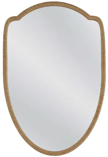 The Miles wall mirror boasts a distinctive shield-shaped design, complemented by a luxurious brass finish. Its modern aesthetic adds a touch of sophistication to any room, while the sturdy wood construction ensures durability and reliability with its elegant charm and timeless appeal.