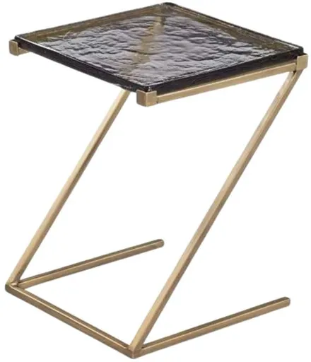 The Corina scatter table features a thick, poured glass top that sits inside iron frames with campaign style corner clips. The iron metal table frame is finished in a liquid gold color. The glass top is created by directing molten glass into a mold where it hardens.