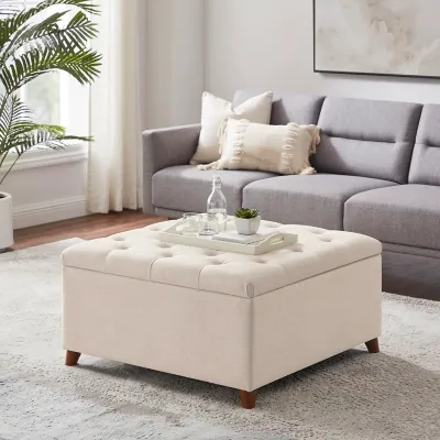 This modern and versatile square ottoman effortlessly blends into any space with its quiet, sophisticated design. Upholstered in soft beige linen weave, it offers comfort as a seat, footrest, or even a stable coffee table. The tufted top opens smoothly on soft-close hinges, revealing a generous storage compartment ideal for pillows, linens, or electronics. With understated eucalyptus wood legs finished in a rich walnut stain, it sits at a convenient 18" seat height, adding both style and function to your living room, bedroom, or reading nook. Perfect for those who value both form and practicality!