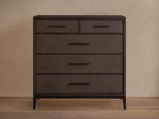 Featuring a sleek aesthetic, our Malone collection is artisan-crafted from solid parawood or oak wood—depending on your preferred finish—and surfaced with walnut or elm wood veneers. Insets made from reconstituted leather embossed with a shagreen pattern are complemented by hand-applied finishes to give this collection a modern look with intriguing textural details.