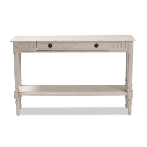 The ornate ball-turned details and the weathered look of the Ariella 1-drawer console table will add an element of romance and bygone times to your home. The country cottage farmhouse-inspired design is evident in the amount of detail put into this console table. The Ariella features one pull-out drawer and a bottom shelf for convenience. The whitewashed finish of the piece and charming, dark bronze finished drawer pulls give the console table a bit of antique style. The Ariella is easy to coordinate with a wide range of styles, including French, rustic, and provincial-inspired decor. Add the Ariella to your entryway or mudroom to delight visitors. Made in Indonesia, the console table requires assembly. Available for Online Purchase Only. Assembly required. This product ships direct from the manufacturer, so RC Willey Delivery is not available.
