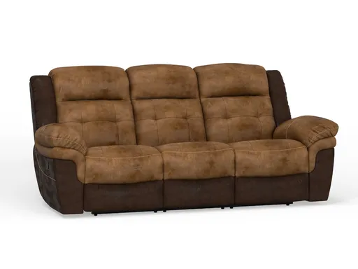 The Buckaroo Reclining Sofa brings rugged comfort and bold style to your living room with its durable construction and striking two-tone design. Upholstered in soft, high-performance polyester fabric, this reclining sofa features a deeper brown on the outside frame and a lighter contrasting tone on the seat, back, and arm cushions for added visual interest. Built on a solid hardwood frame, the Buckaroo is made to last and supports up to 350 lbs per reclining seat, making it a sturdy and reliable choice for everyday lounging.
