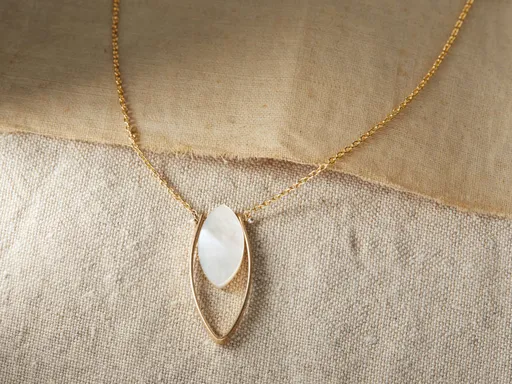 Our Allaire Necklace’s contemporary pendant design features a gilded lotus petal with a faceted marquise-cut mother of pearl suspended in its center. Handcrafted by Lulu Designs in Mill Valley, California, our exclusively curated jewelry collection showcases unique designs that combine organic textures and traditional elements, celebrating the natural beauty of hand-worked metals and stones.