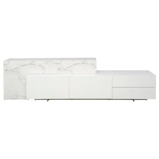 Clean, bright and vibrant, the Alliance White TV Stand is everything you've been wanting for your entertainment space. Made with Carrara marble, it features a lovely two-tone combination, smooth, glossy look, and modern style. Plus, with four storage drawers with fully finished interiors, it has all the space you could need.