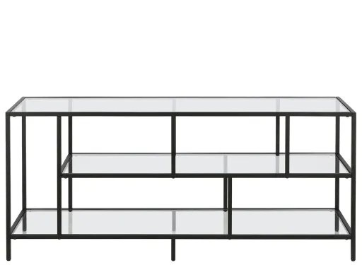 A must-have for living areas and entertainment spaces, this Winthrop 55" TV stand with glass shelves sets the stage for the big game, a movie marathon, or that season finale everyone's been talking about. Crafted from steel it strikes a clean-lined silhouette and boasts glass shelves for a look that blends with nearly any color palette.