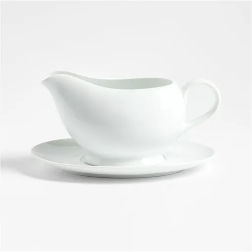 Alongside virtually any dinnerware, this versatile and simply-styled white boat pours gravy, reductions, dressings and sauces. Saucer catches the drips before they hit the table or linens.