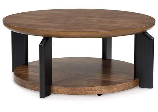 Experience the captivating allure of the Kraeburn coffee table, an effortless blend of casual and refined aesthetics. Its two-tone finish combines satin black with a rich brown wood tone for a modern, relaxed vibe that you'll love. Perfectly suited for your contemporary home, it offers open storage to accommodate your favorite books and accessories. Your search for simple, chic design ends here.