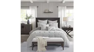 Add a quaint farmhouse charm to your bedroom with the Signature Essence Cotton Clip Jacquard Comforter Set. This cotton clip jacquard gray comforter features a pieced design with striped pattern and decorative buttons, for a casual look. Two matching shams and two coordinating Euro knit shams complement the top of the bed. Also included are three decorative pillows: one knit square, one trimmed square with embroidery details, and one carpet stitch oblong with decorative embroidery details that add the finishing touches to this set. The removable comforter filler is included, machine washable, and allows for easy cleaning while the comforter cover is dry clean only for best results.
