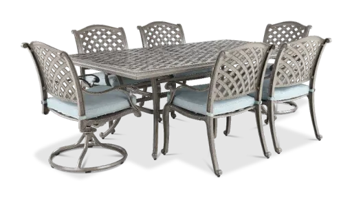With traditional style and timeless design, this 7 piece patio dining set from the Macan collection is a welcome addition to any outdoor living space. The spacious patio table features a decorative lattice tabletop design and a durable metal frame. Four lattice back dining chairs feature gently curving legs and deep cushions for comfortable seating. Two swivel rocking chairs add ease and fun to the set, allowing you to turn from side to side or rock back and forth while enjoying the company of family and friends. Set includes a rectangular dining table, four dining chairs, and two swivel rocking chairs.
