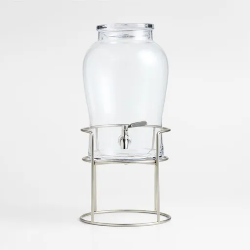 Our elegantly curved glass Beau drink dispenser gives guests a view of your festive punches and refreshing infusions, and the stainless steel spigot provides an easy pour every time. Its classical glass lid allows for easy refills of ice or fluids so the drinks and festivities can keep flowing. A clean-lined stand of nickel-plated iron elevates the dispenser so glasses can easily fit under the spigot.