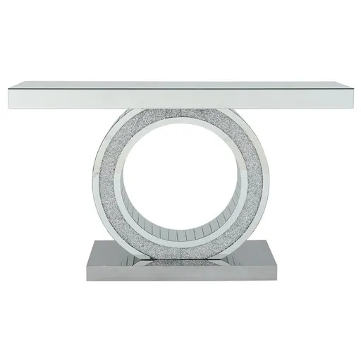 Define the space of your modern home with the shimmery aesthetic of the Glitzen Console Table. This design features a silver look, a glamorous ring with crystal accents, decorative mirror details, and a polished stainless steel base. Versatile and graceful, this dazzling piece can be placed in the entryway as a welcoming sight, in the dining room to hold your cocktails, and in the living room to display a vase or art piece. The possibilities are up to your imagination.