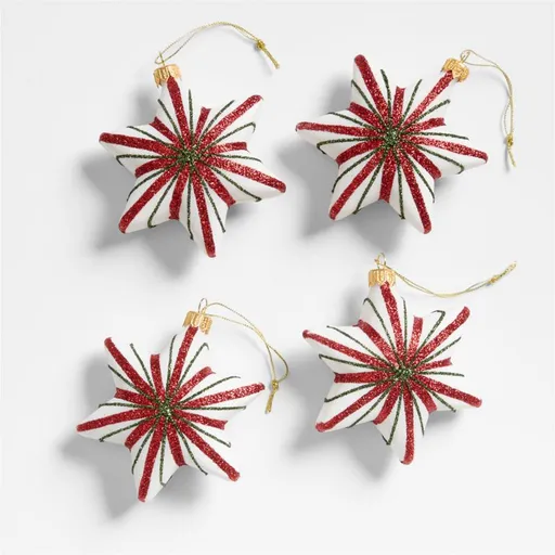 Evoking lovingly decorated Christmas cookies, our star ornaments dress your Christmas tree with exquisite artisanship. The hand-blown glass is painted by hand and accented with radiating stripes of classic red and green glitter on snow-white that sparkle in the glow of string lights. These four gorgeous confections suit formally and playfully decorated trees alike.
