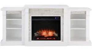 Set your heart aflame with this lodge-inspired, smart Harrow Fireplace. Bookcase storage shelves media, novels, or trinkets. Fresh white melds with simulated stone for a rustic touch on this traditional fireplace silhouette. Glowing faux fire logs add ambiance with flickering LED flames and lifelike embers, with or without heat. Low profile and wide scale, this electric fireplace with bookcases turns on chic stylebeneath your wall mounted TV in the living room or as a sleek buffet in the dining room.