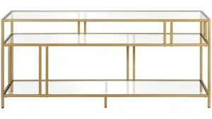 A strong linear profile sets this industrial-inspired Courtland TV stand with glass shelves apart. It's double-barred accents offset the 3 tiers of durable glass shelving, creating an artful backdrop for your media collection or decorative items.