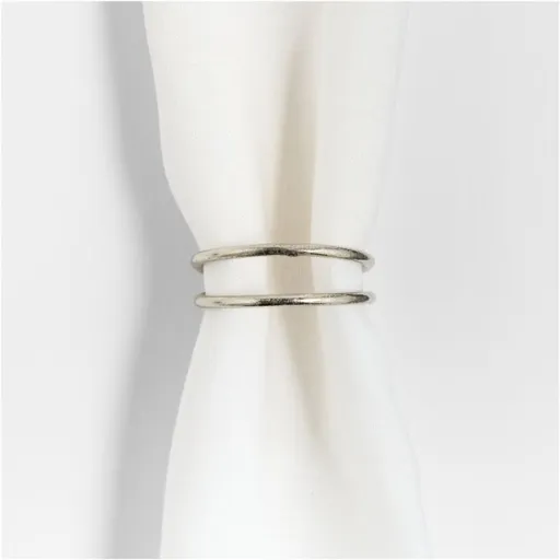 A simple, organic shape entwines silver bands with a soft, lustrous finish to form a beautiful napkin ring for elegant table settings and special occasions. Made of stainless steel with a silver finish, the two-ring design looks elegant with formal dinnerware and adds sparkle to casual linen and cotton napkins for everyday meals. We love the hint of glimmer with all-white or monochromatic place settings. Napkin rings can secure napkins in a range of folded designs, from the simple roll to the fan fold or double candle fan fold.