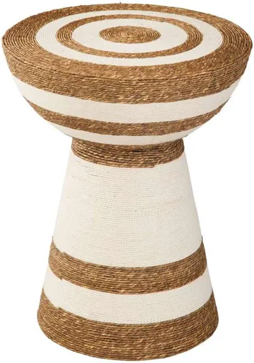 Introducing the Jayce accent table, a bohemian-inspired piece featuring calming tan tones. Crafted from iron and jute, it boasts a natural and contrasting finish, adorned with tan and white horizontal stripes, adding a touch of playful charm. This circular, drum-shaped table is artfully constructed with natural jute fibers.