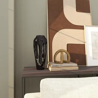 This black centerpiece vase will look stunning on tables and desks, adding an opulent touch to living rooms and office. Designed with felt or rubber stoppers at the base that prevent scratching furniture and table tops, as well as sliding around. This item ships in 1 carton. Aluminum vase makes a great gift for any occasion. Suitable for indoor use only. This item ships fully assembled in one piece. Made in India. This is a single black colored vase. Contemporary style. Vase has a 4.50 in mouth opening.
