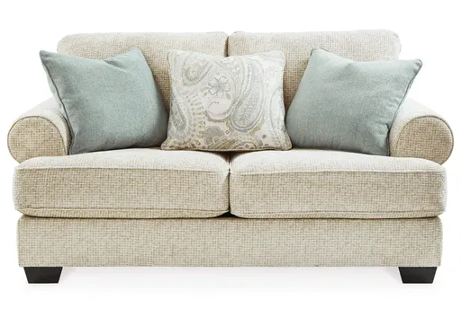 The Monaghan loveseat strikes a beautiful balance between classic and current. Its traditional elements include t-cushion seating and setback roll arms, angled for modern flair. Posh pillows in spa mist and jacquard paisley make a muted, mellow complement to the loveseat’s casual textured chenille upholstery. And the choice of sandstone beige is a light and lovely style awakening.