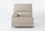 The Watkins Linen Leather Power Cordless Left Arm Facing Recliner with Power Headrest & USB is a casual style recliner made of real leather in a beige color. It features a power recliner, tight back, and USB, and is part of a modular configuration with top grain leather and Verona linen match.