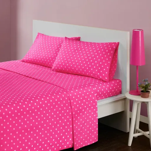 Brighten up your room with the Mi Zone pink polka dot sheet set from RC Willey. The bold colors and fun print will liven up any room. Made from 100% cotton percale, this sheet set will last wash after wash. The fitted sheet will fit up to a 14 mattress. This set includes a fitted sheet, a flat sheet, and a pillowcase.