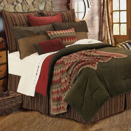 Knit, chenille, and faux leather are layered together in this queen size bedding set giving it a cozy cabin look. Shades of green, brown and red in a classic corduroy and rustic stripes give the Wilderness Ridge collection a timeless, versatile appeal. This queen 6 piece bedding set includes a comforter, reversible bed skirt, 2 pillow shams, and 2 toss pillows.