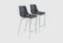The Lagnus Black + Silver 39.8" Counterstool Set Of 2 combines modern style with functional design. These counter-height stools feature a sleek black and silver color scheme, perfect for any contemporary dining room, kitchen, or living room. With their armless, curved seat and sturdy plywood construction, these stools offer both comfort and durability.