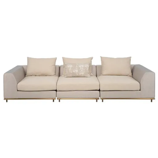 The Hanna Beige Sofa brings an undeniable touch of elegance and glamour to your space. With its loose cushions for added comfort and sleek golden metal legs, it perfectly blends functionality and style. Wrapped in warm beige tones, this piece from the exclusive Carlos Perazzi Collection is a timeless addition to any modern home.