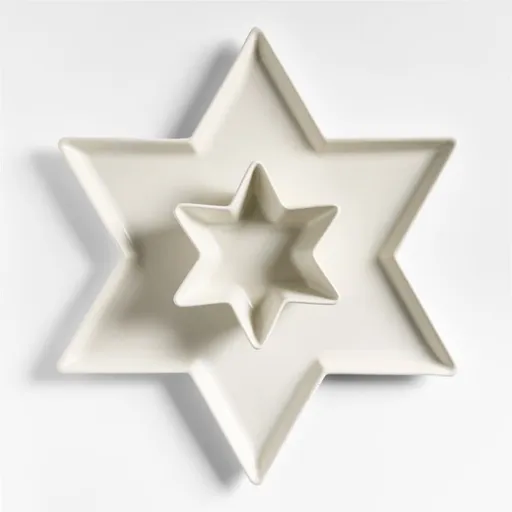 Dazzle your Hanukkah guests with this Star of David-shaped platter and dip bowl set. The six-pointed star plate and bowl are glazed by hand in ivory with semi-matte finish. We love how the set makes pairings such as latkes and sour cream, tortilla chips and salsa, and sufganiyot and chocolate sauce the star of a buffet spread or dinner table.
