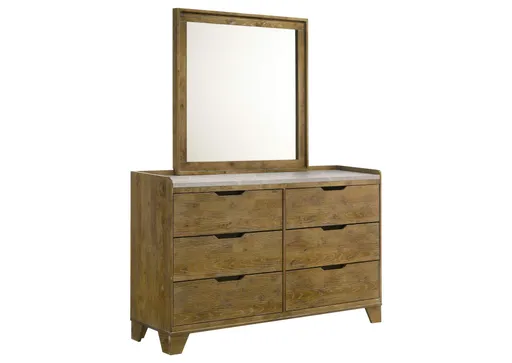 Elevated by its balance of texture and tone, this six-drawer dresser with mirror brings rustic charm into refined focus. Crafted from solid rubberwood and finished in a warm medium oak, the embossed wood grain adds depth and dimension. A faux marble melamine top lends a soft, contemporary contrast, while the framed mirror enhances brightness and symmetry. Smooth drawer function and minimalist finger pulls complete this harmonious blend of beauty and utility.