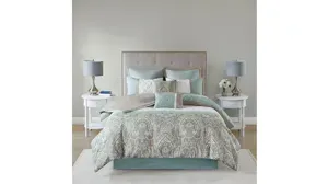 Update your bedroom with the refined elegance of Shawnee Cal King 8-pc.Comforter Set. Showcasing a pieced design with quilting details, this ultra-soft microfiber comforter flaunts a printed damask motif in seafoam and brown hues to create a luxurious look. A solid brown reverse complements the top of the bed, while the matching shams reiterate the design of the comforter for a chic coordinated ensemble. The seafoam shams feature brown flanges that add a charming touch and twodecorative pillows provide a lavish accent. Completing the comforter set is a solid seafoam bed skirt that offers a clean finish, giving your bedroom decor a beautiful allure.