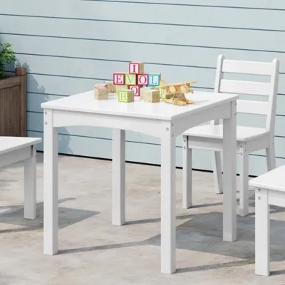 Gather your little ones for dinner or playtime with our kids' plastic toddler kitchen table, which can also be used as a kids' play table. Crafted from durable, kid-friendly HDPE material that is all-weather resistant, UV and fade resistant, this table will maintain its charming color season after season, especially when used as an outdoor play table. Designed not only for longevity and durability but also for safety, the rigid table top, reinforced bottom rail and thick, sturdy legs ensure stability. Cleaning is a breeze: simply wipe clean with lukewarm water, mild soap, and a soft bristle brush, or use a power washer for tougher stains without worrying about damaging the durable material.