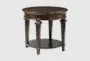The Ross Round End Table is a traditional piece of furniture made of wood, engineered wood, and poplar, with an espresso finish and a brown color that fits perfectly in any living room. This end table also features an open bottom shelf and requires assembly.