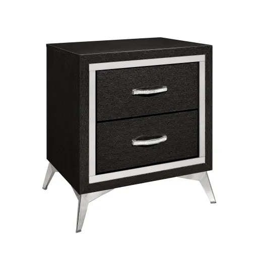 The Huxley 2-Drawer Nightstand in Black offers a blend of contemporary glam and durable construction for your bedroom. This nightstand is carefully crafted from manufactured woods and eco-friendly decorative laminate, ensuring it will last for years. The design features clean lines with metallic accents and flared silver legs for a modern touch. Its rich black finish provides a sleek, sophisticated look that is both timeless and modern, with bold black highlighting the metallic accents and smooth surfaces for a chic, polished aesthetic. The quality drawer construction includes English dovetail joinery and smooth-rolling center glides for long-lasting operation. Functional and fashionable, this nightstand provides ample storage for bedside essentials, with chic, crystal-studded drawer pulls for easy access.
