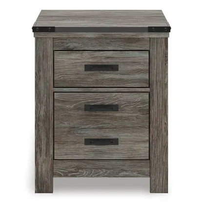 Cool, casual style is for all ages. With this nightstand, they get the function they need paired with the refined design you love. Approachably neutral in a rustic warm gray, it’s adaptable enough to pair with an assortment of existing colors and room decor. Faux metal detailing with nailhead accents lends an industrial edge. And a smooth-gliding drawer and open cubby offer storage for favorite books and other bedtime necessities. Techy toys running low on power? The handy included USB ports allow you to charge devices with ease.