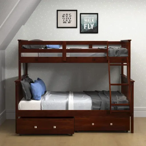 This dark cappuccino brown twin-over full bunk bed with storage drawers offers timeless charm and enduring simplicity that promises to be a stylish addition to your child's room for years to come! Its Mission-inspired design is sturdily crafted from solid pine and finished in a classic, versatile color that will effortlessly blend in with, and enhance, a wide range of tastes and spaces. Its 2 included storage drawers will help you child keep their items organized and tidy. This bed comes with a mattress ready slat system, so there is no need for box springs or a bunkette board. Available for Online Purchase Only. Assembly required. This product ships direct from the manufacturer, so RC Willey Delivery is not available.