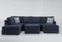 Introducing the Colby Navy Blue Fabric 128" 3 Piece U-Shaped Sectional with Right Arm Facing Chaise & Left Arm Facing Corner Chaise & Storage Ottoman. This versatile sectional is designed for comfort and functionality, making it a perfect addition to any living room. Upholstered in durable 100% polyester fabric, its deep navy color adds a touch of sophistication to your space.
