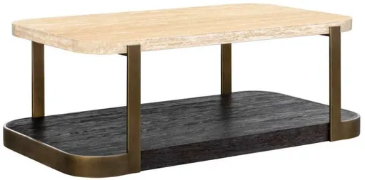 The Avalon cocktail table embodies a seamless blend of modern and contemporary elements, exuding sophistication and timeless elegance. Crafted with a trio of mixed materials, including beige travertine stone for the top, a bronze-finished metal frame, and an espresso oak-finished bottom shelf, this piece adds a touch of luxury to any space.